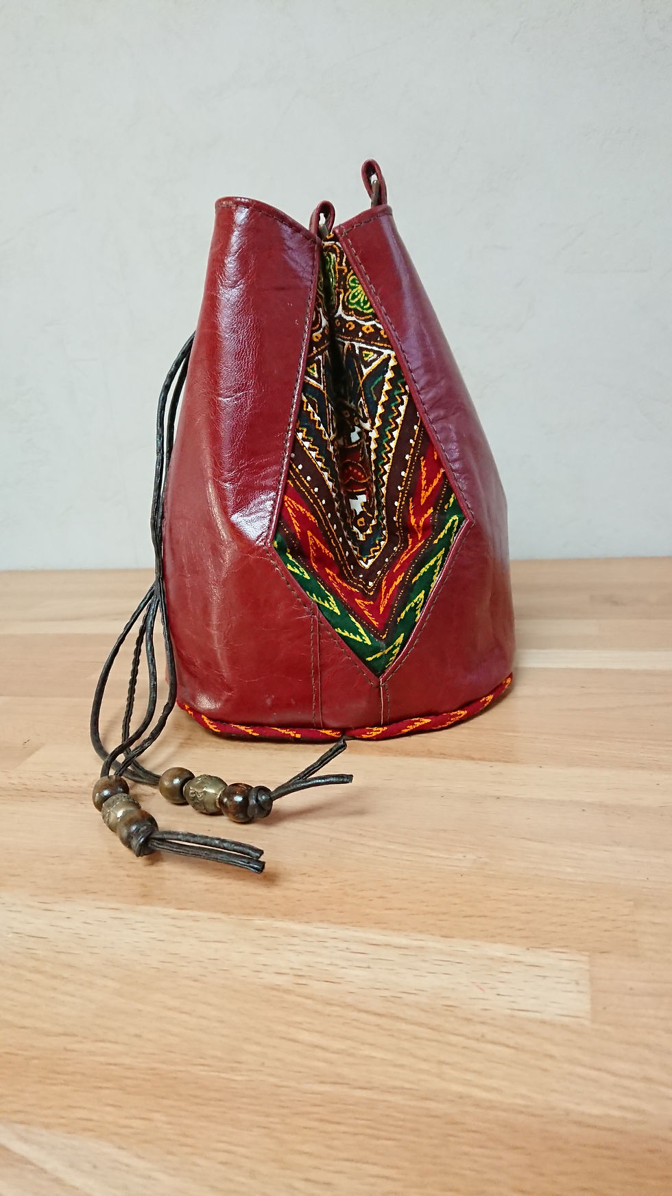 Sac seau en cuir de chèvre à incrustations de tissu, inspiré par des matériaux que j'avais réunis.