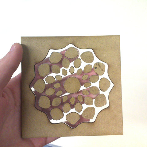 Recherches de prototypage numérique. Notamment : marqueterie de bois et plexiglas, impression d'image avec une découpeuse laser, impression 3D.
